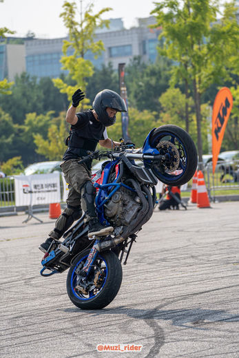 앞바퀴를 들어올려 오토바이를 뒷바퀴만으로 주행하는 기술입니다. 균형 감각과 조작 능력이 매우 중요합니다.